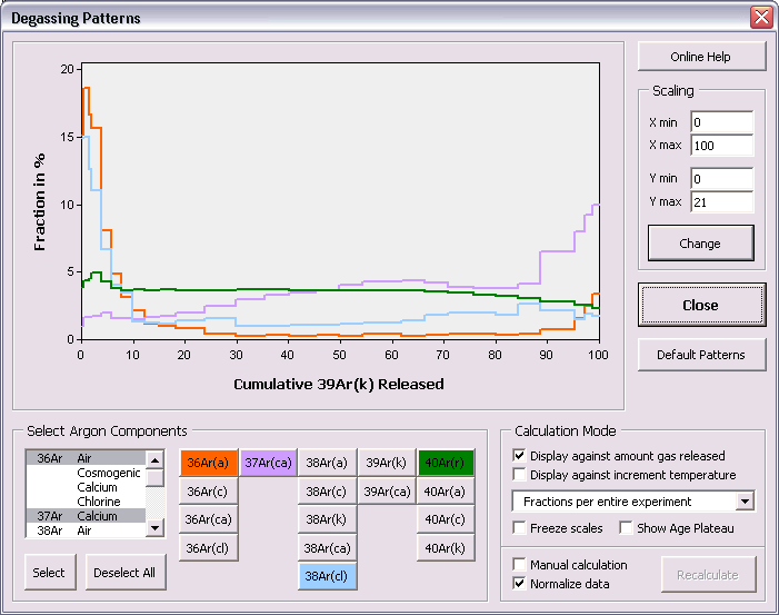 The degassing of whole rock and basaltic groundmass samples during incremental heating experiments can be rather complex (for example Koppers et al. 2000 and 2004). The Degassing Patterns Toolbox is provided to you to better study and understand these degassing behaviors. In the example below of a submarine groundmass sample, the measured intensities of four argon components are shown, as indicated by the orange, purple, light blue and green buttons in the Select Argon Components panel. This is an interesting view of the degassing behavior of this sample, but the signal is rather erratic and the high intensity for the 40Ar(r) Component forces the other components to be nearly invisible near the bottom axis. This view becomes much more useful, if we normalize the signal (i.e. intensity) to the step size, as shown in the second example below. The 40Ar(r) Component now closely resembles the shape of the age spectra, which is what we are expecting, yet its intensity still overwhelms the other components. This problem gets alleviated as well, if we plot the degassing patterns as fractions over the entire experiment. This is shown in the third example below and clearly brings forward the low intensity components in the same plot. As it turns out, this experiment shows large spikes in the 36Ar(a) and 38Ar(cl) Components for the low temperature increments and another spike in the 37Ar(ca) Component for the high temperature increments. These are very useful observations that will help you in the interpretation of complex argon age spectra.
