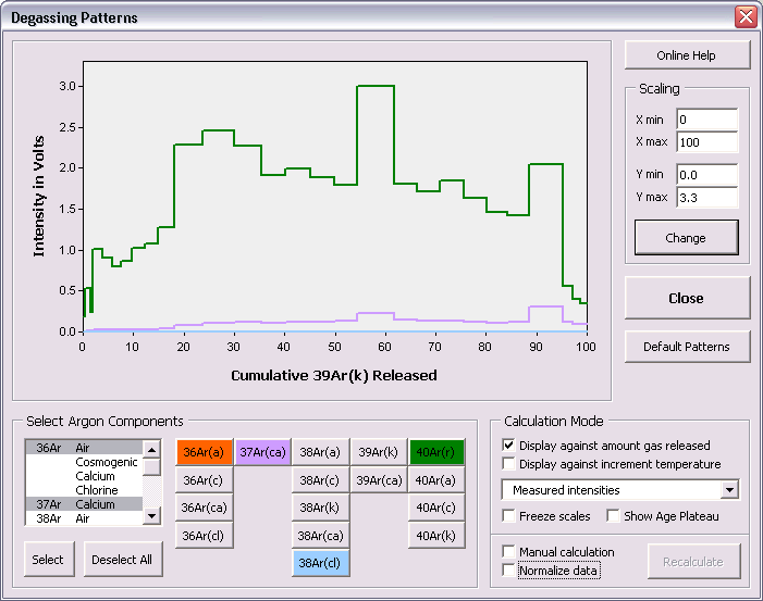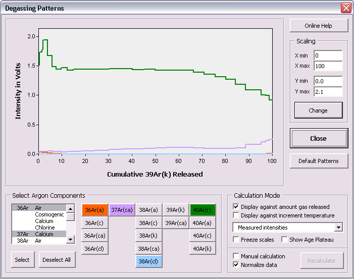 add a horizontal bar to the plot, indicating the position of the age plateau. Check the Normalize Data checkbox if you want the normalize the intensities measured against the step size or the amount of 39Ar(k) in