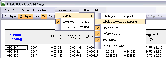 You can show or hide Labels for the Selected data points (green squares) in your isochron diagrams by toggling this menu item. The labels always show you the Temperature for a specific (incremental heating) data point. For example, 0.06W or 1500°C.