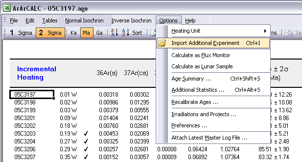 You can also Combine Multiple Experiments in single ArArCALC age calculation workbooks, when using the Options # Import Additional Experiment menu item. This functionality allows you to combine analyses from co-magmatic mineral separates (e.g. plagioclase and hornblende) from one rock sample into a single isochron calculation. Also, multiple total fusion experiments for one flux monitor standard can be merged into one calculation. Finally, this functionality allows you to combine or directly compare sample splits measured in different laboratories or from different irradiations.