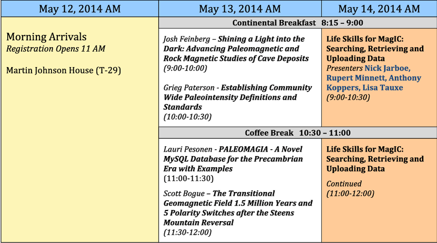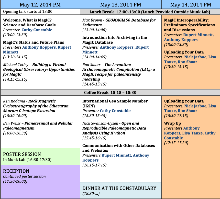 The 2014 MagIC Workshop will feature keynote talks (45 minutes) with extended discussions (15 minutes), and science talks (20 minutes, 10 minutes discussion) on the application of the MagIC database in paleomagnetic, geomagnetic and rock magnetic research.